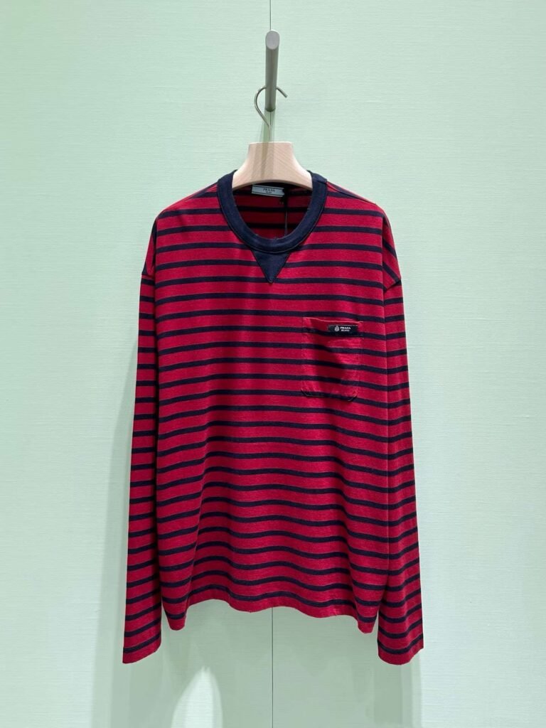 PRADA’s new cotton striped long-sleeved T-shirt is made of soft cotton jersey fabric.