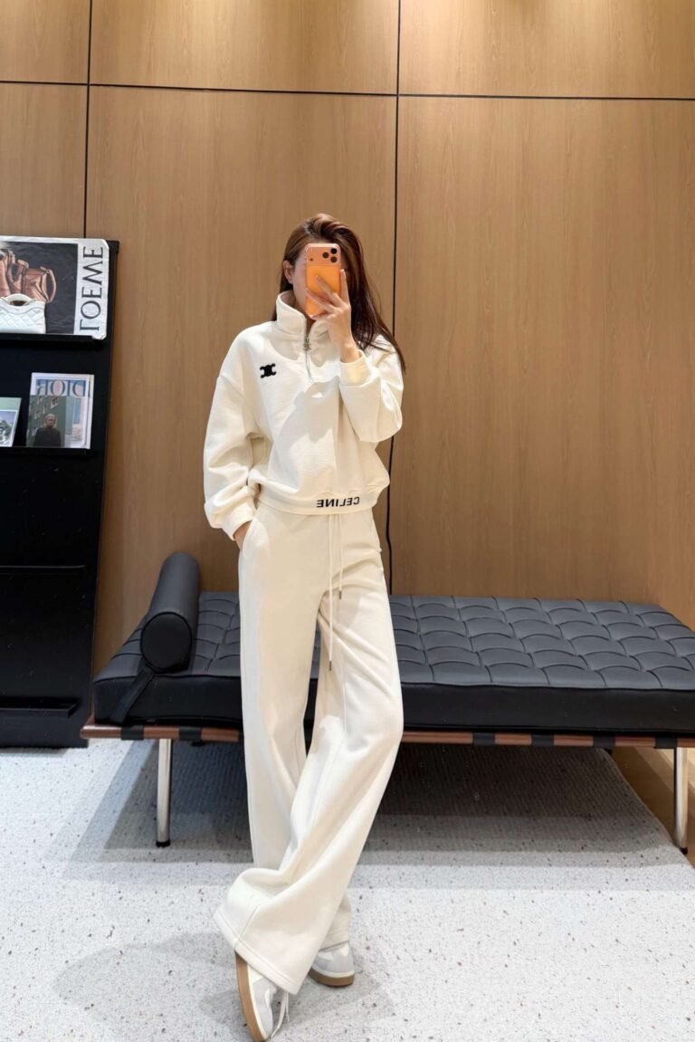 Celine collared sweatshirt and wide-leg pants set with elastic waistband.